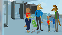 A father explains to his son how to go through security at the airport before getting on a plane.