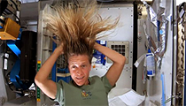 An astronaut shows how she keeps her hair clean in the International Space Station.